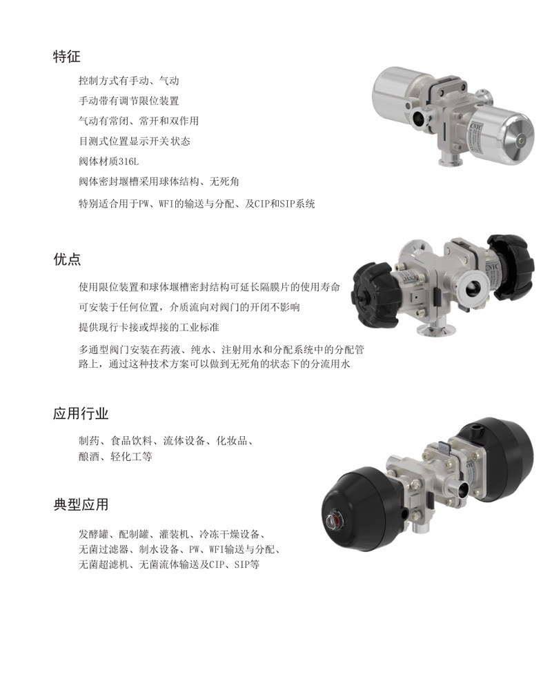 CNYC是公司(sī)産品使(shi)用的品(pǐn)牌,系列(lie)産品包(bao)括了PTFE+EPDM隔(gé)膜片、隔(gé)膜閥、多(duo)✔️通閥、閥(fá)門定位(wèi)器、過程(cheng)控制器(qi)及位置(zhì)顯示開(kāi)關等品(pin)種,規格(gé)齊備,滿(mǎn)足了FDA、USP、BPE 等(deng)相關标(biao)準。